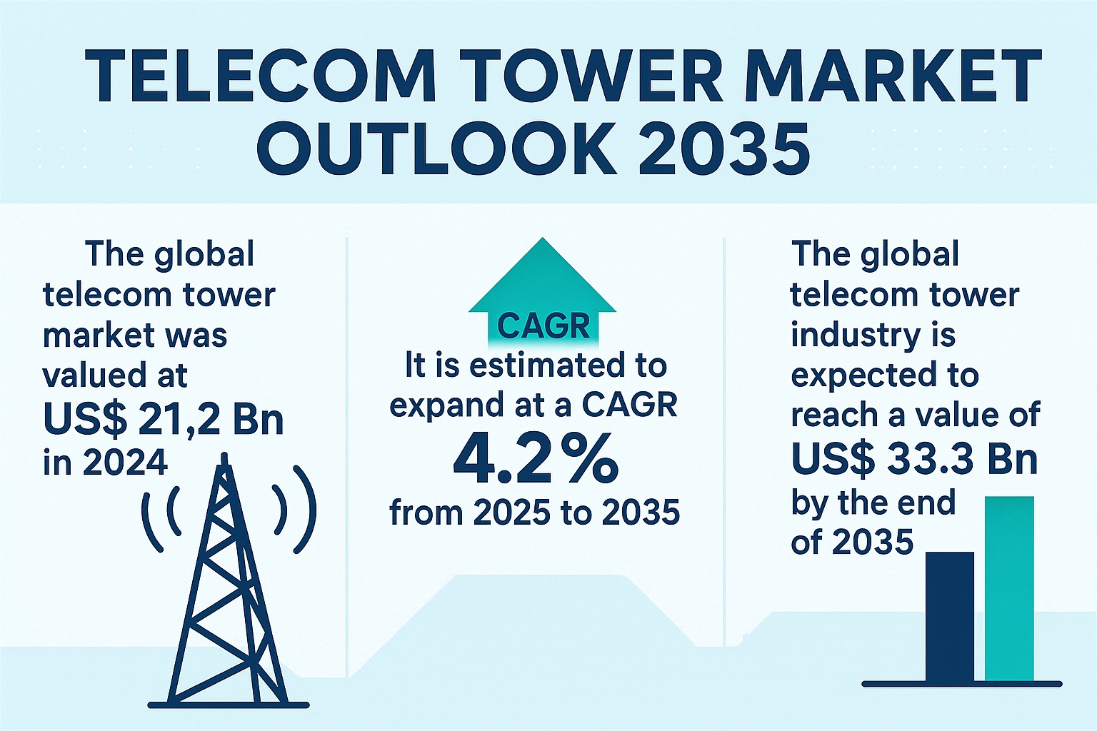 The global telecom tower market continues to be the backbone of digital connectivity, supporting mobile communication, data transmission, and the rapid roll-out of next-generation networks. The market, valued at US$ 21.2 Bn in 2024, is set for sustained expansion as operators and tower companies increase investments in 5G infrastructure, network densification, and fiber integration. According to industry estimates, the market is projected to expand at a CAGR of 4.2% between 2025 and 2035, reaching an impressive US$ 33.3 Bn by 2035. This steady growth reflects long-term demand for uninterrupted connectivity, the surge in mobile data consumption, and broader government-led digital inclusion initiatives.