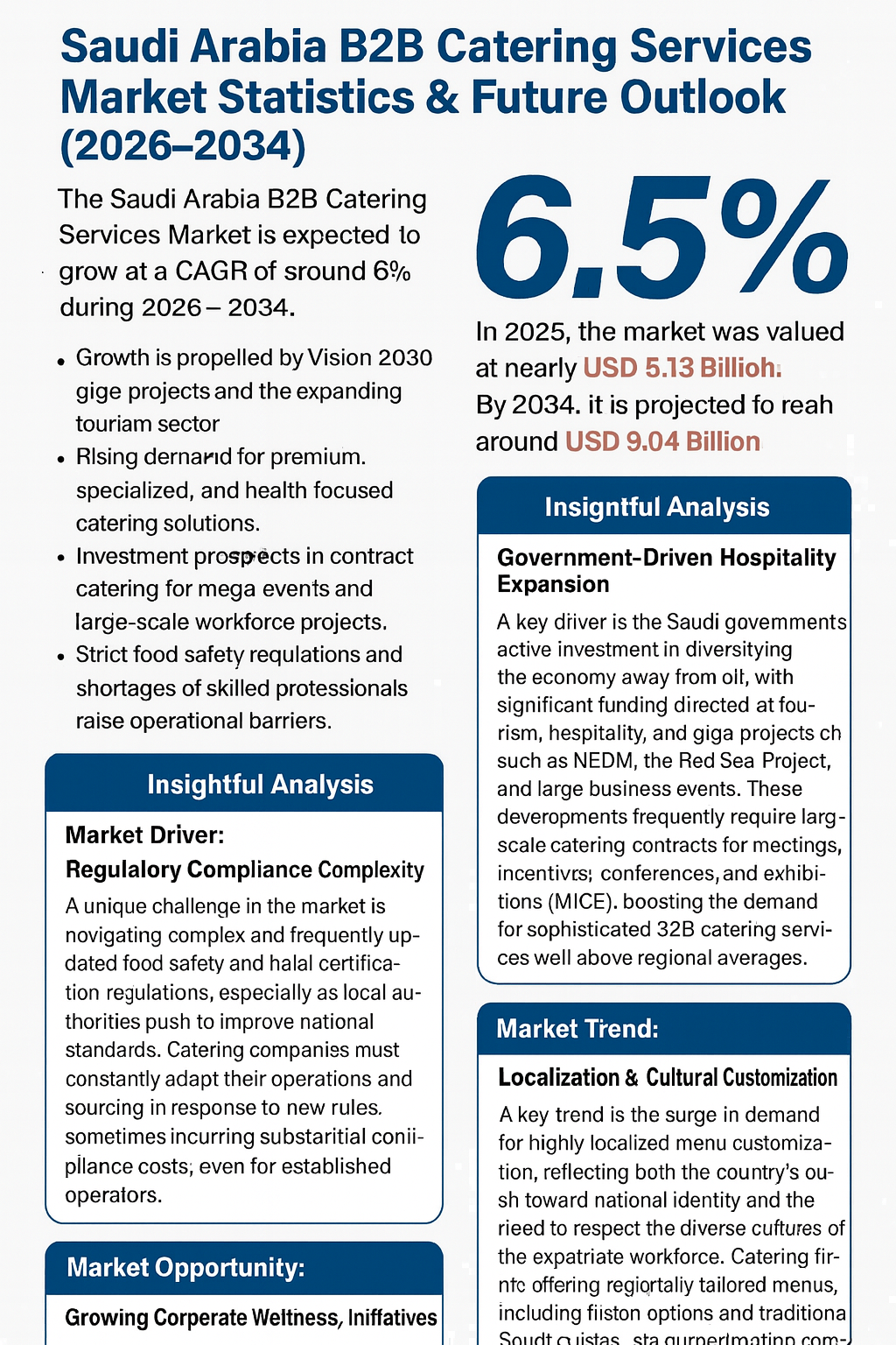 According to the latest report by The Report Cube, study Saudi Arabia B2B Catering Services Market is expected to grow at a CAGR of around 6.5% during 2026 - 2034. In 2025, the market was valued at nearly USD 5.13 Billion, by 2034, it is projected to reach around USD 9.04 Billion. Growth is propelled by Vision 2030 giga-projects and the expanding tourism sector. Rising demand for premium, specialized, and health-focused catering solutions.