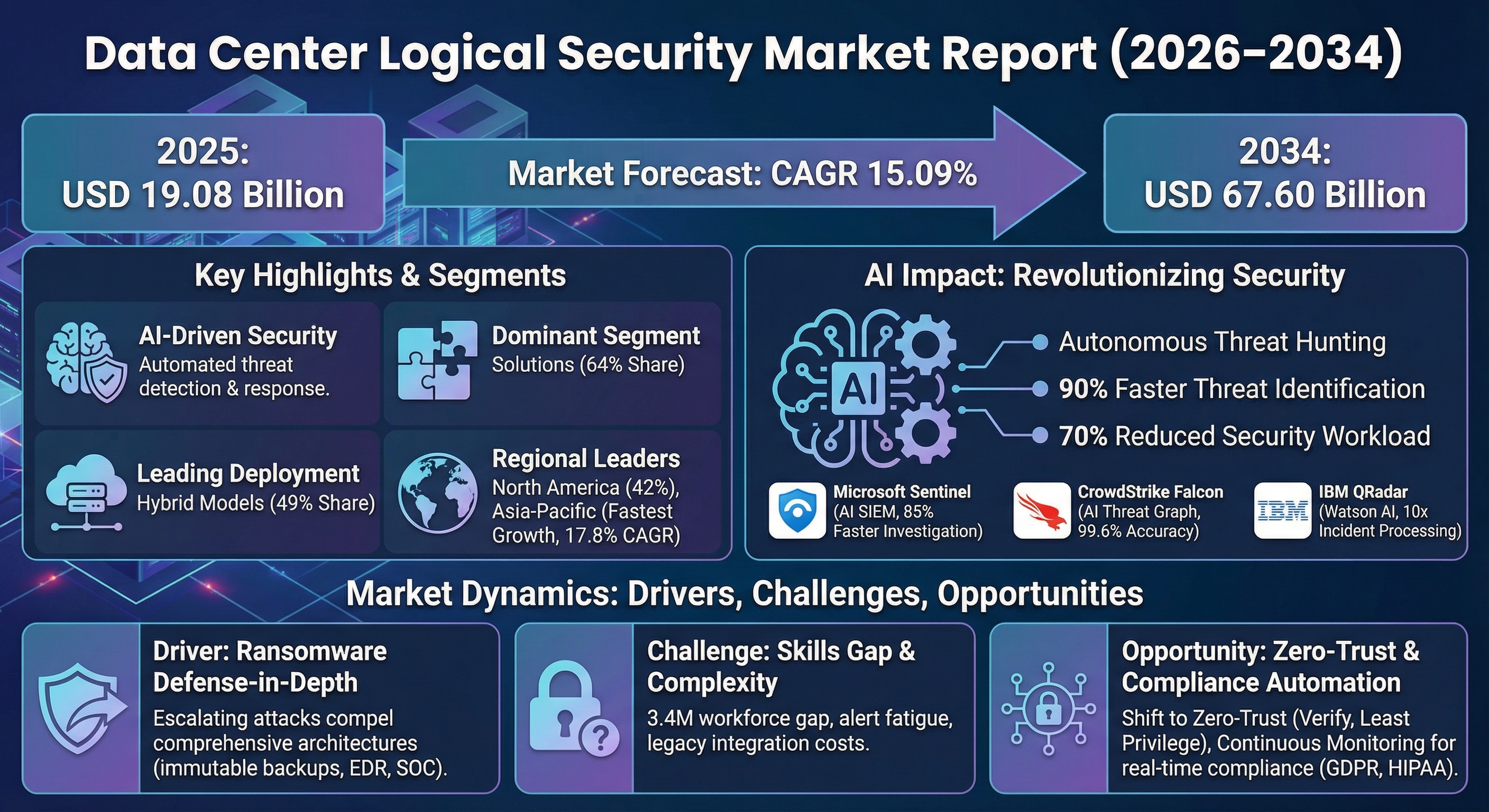 • According to the latest report by The Report Cube, study Data Center Logical Security Market valued at USD 19.08 billion in 2025, is projected to reach USD 67.60 billion by 2034, registering a CAGR of 15.09% from 2026-2034.