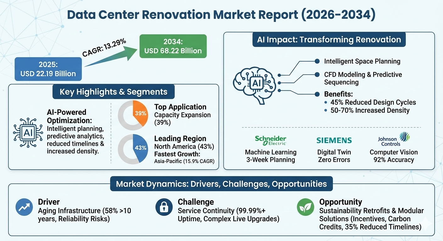 • AI-powered design optimization and predictive analytics transforming renovation planning and execution across Data Center Renovation projects.