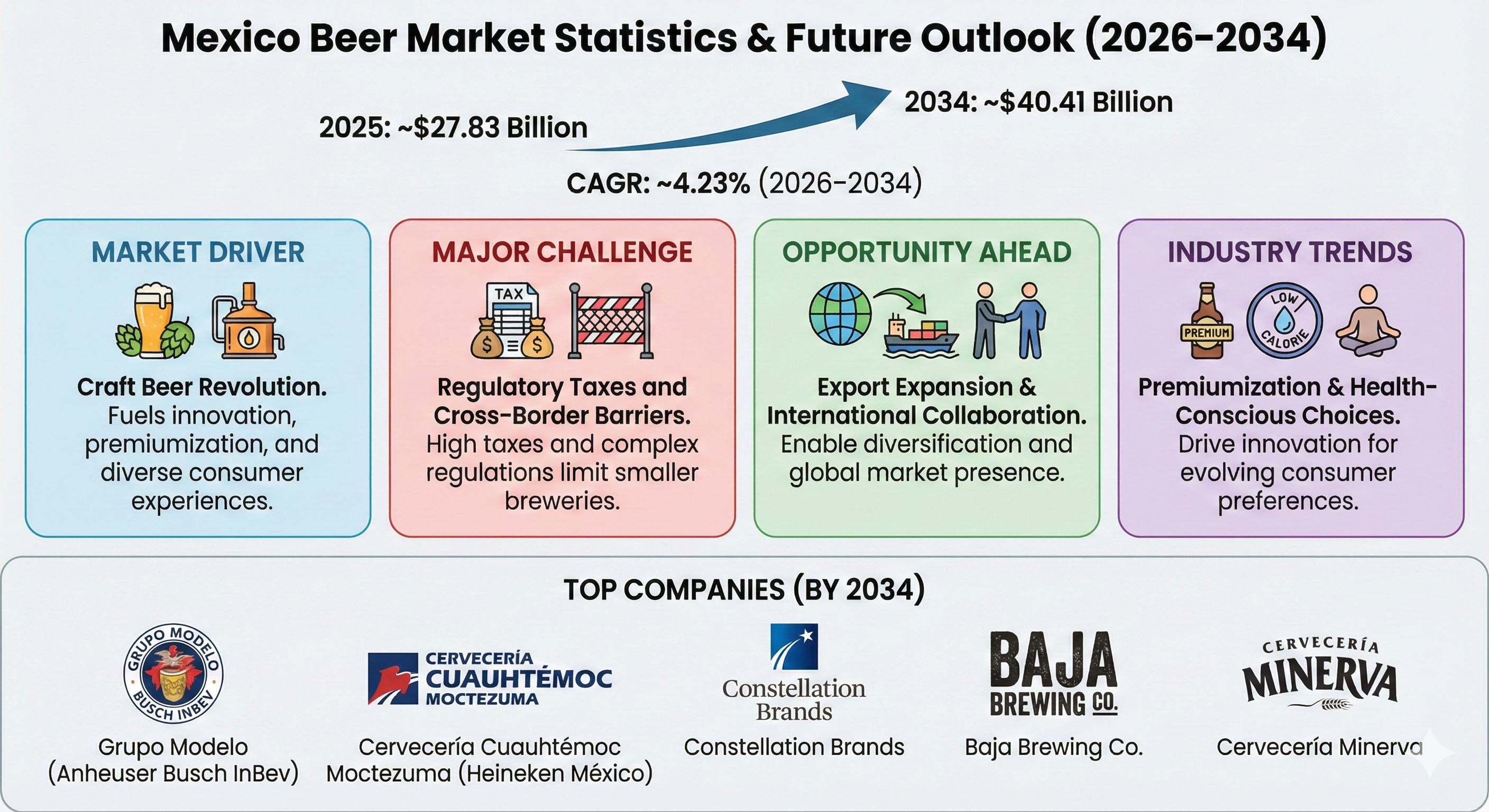 Regulatory Taxes and Cross-Border Barriers: One key challenge distinct to Mexico is the imposition of high excise taxes and complex regulatory frameworks, particularly impacting smaller breweries. Such financial and compliance hurdles can restrict market entry, limit expansion, and inflate prices, ultimately hindering growth especially for craft and local producers, making industry competitiveness highly skewed toward large multinationals.