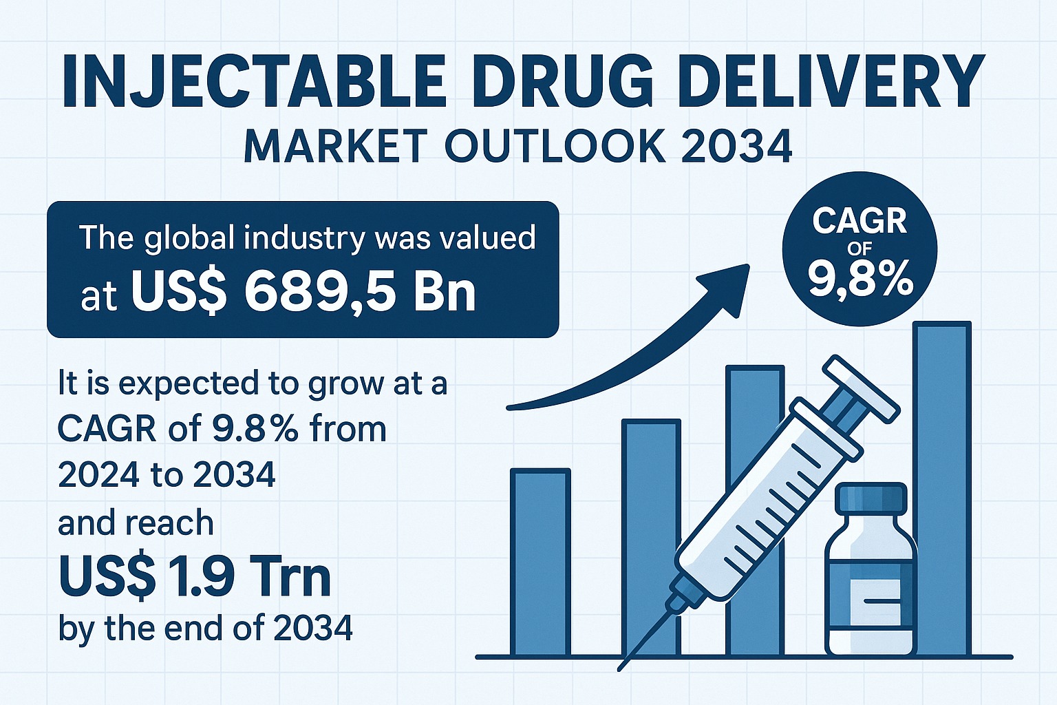 The global healthcare landscape is experiencing a major transformation fueled by technological evolution, the rise of biologics, and increasing demand for self-administered therapies. The injectable drug delivery market, a critical segment that supports modern treatment modalities, is projected to record robust expansion over the next decade. Valued at US$ 689.5 billion in 2023, the market is expected to reach approximately US$ 1.9 trillion by the end of 2034, reflecting an impressive compound annual growth rate (CAGR) of 9.8% from 2024 to 2034.