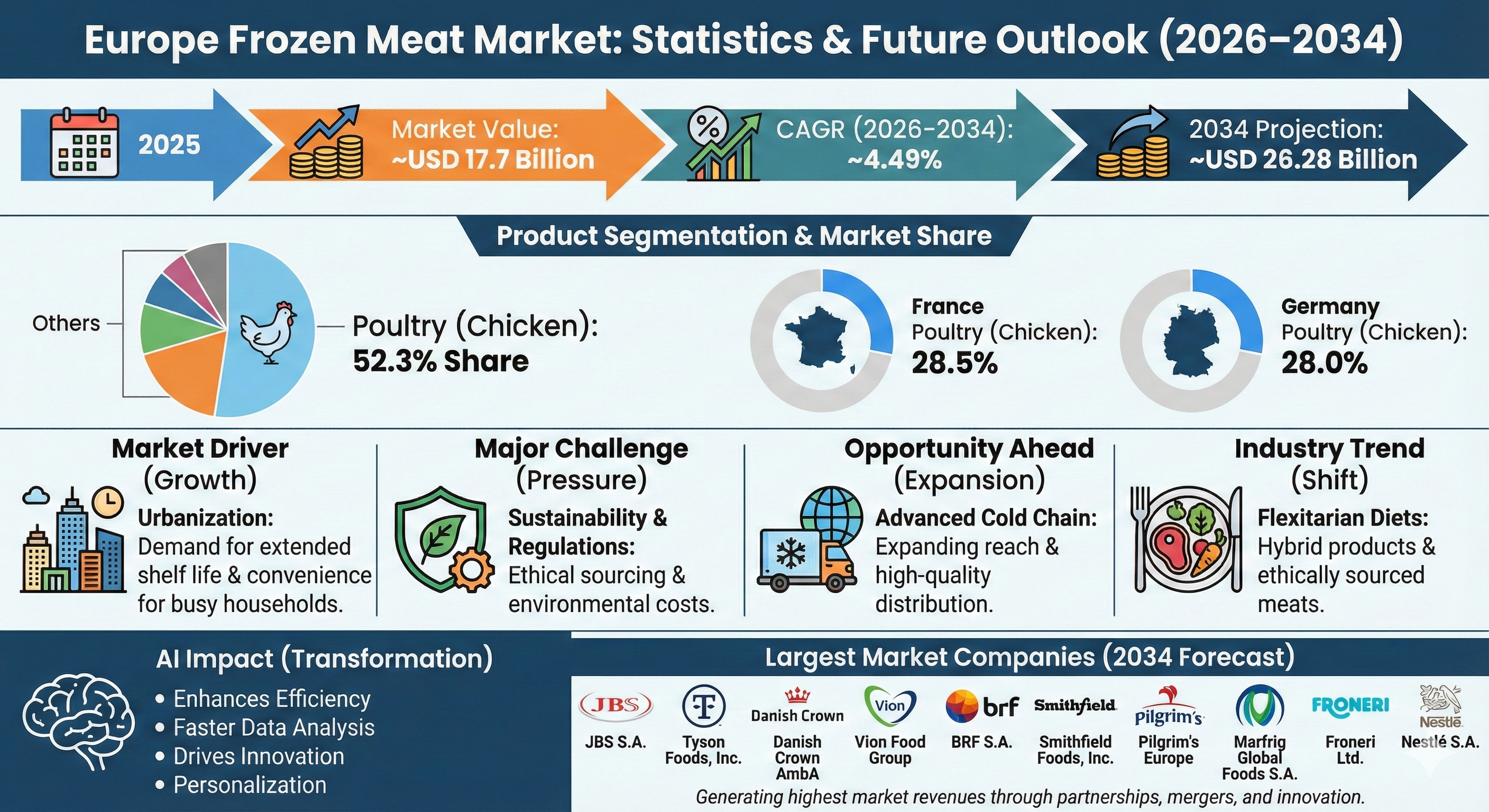 • According to the latest report by The Report Cube, study Europe Frozen Meat Market is expected to grow at a CAGR of around 4.49% during 2026 - 2034.