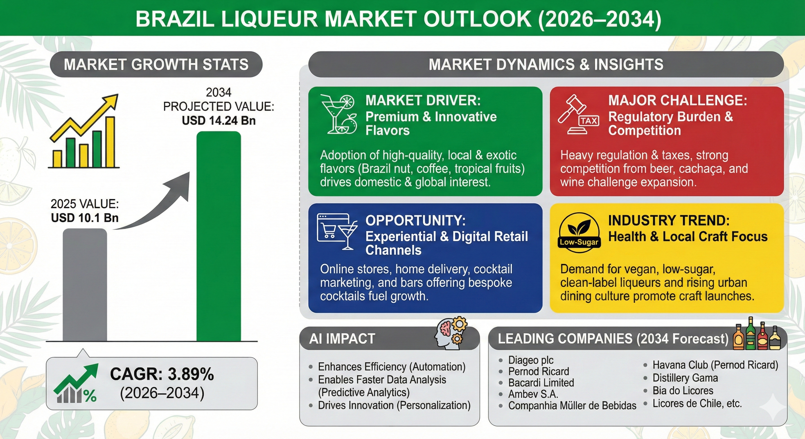 - Heavy regulation, taxes, and competition from beer, cachaça, and wine challenge market expansion.
