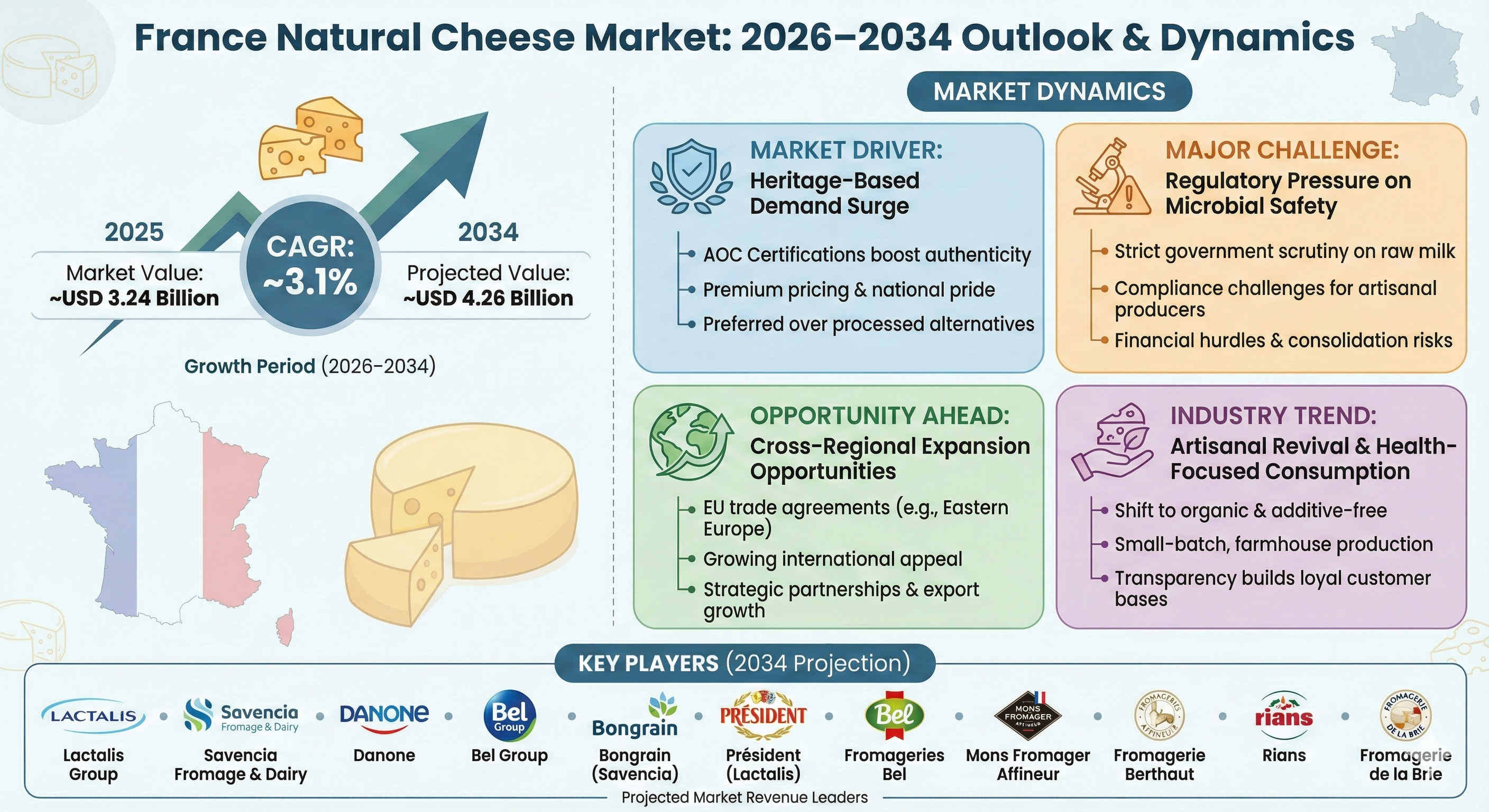 - Cross-regional expansion opportunities through EU trade agreements and growing international appeal of traditional French cheeses.