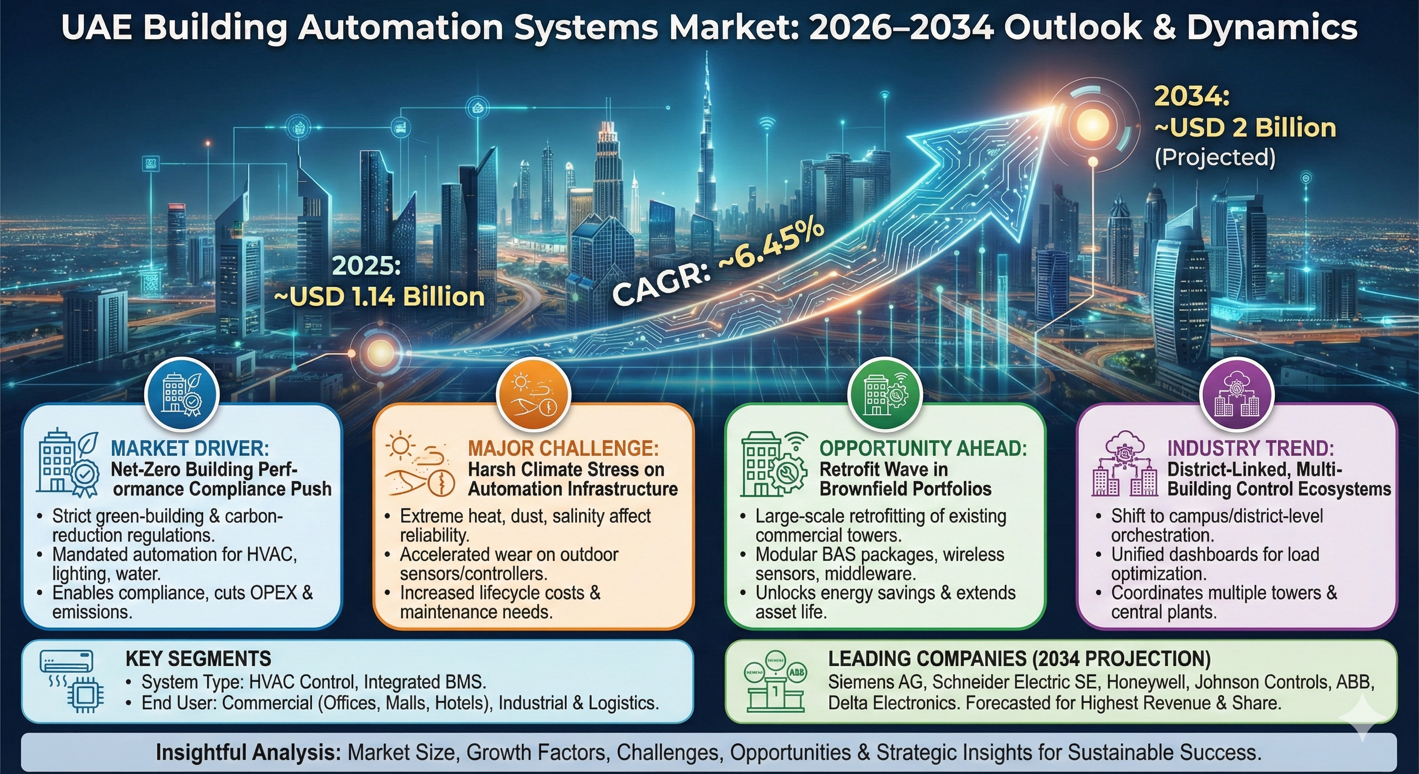 • Regulatory push for net-zero and green-building compliance drives automated control of HVAC, lighting, and water systems in UAE developments.