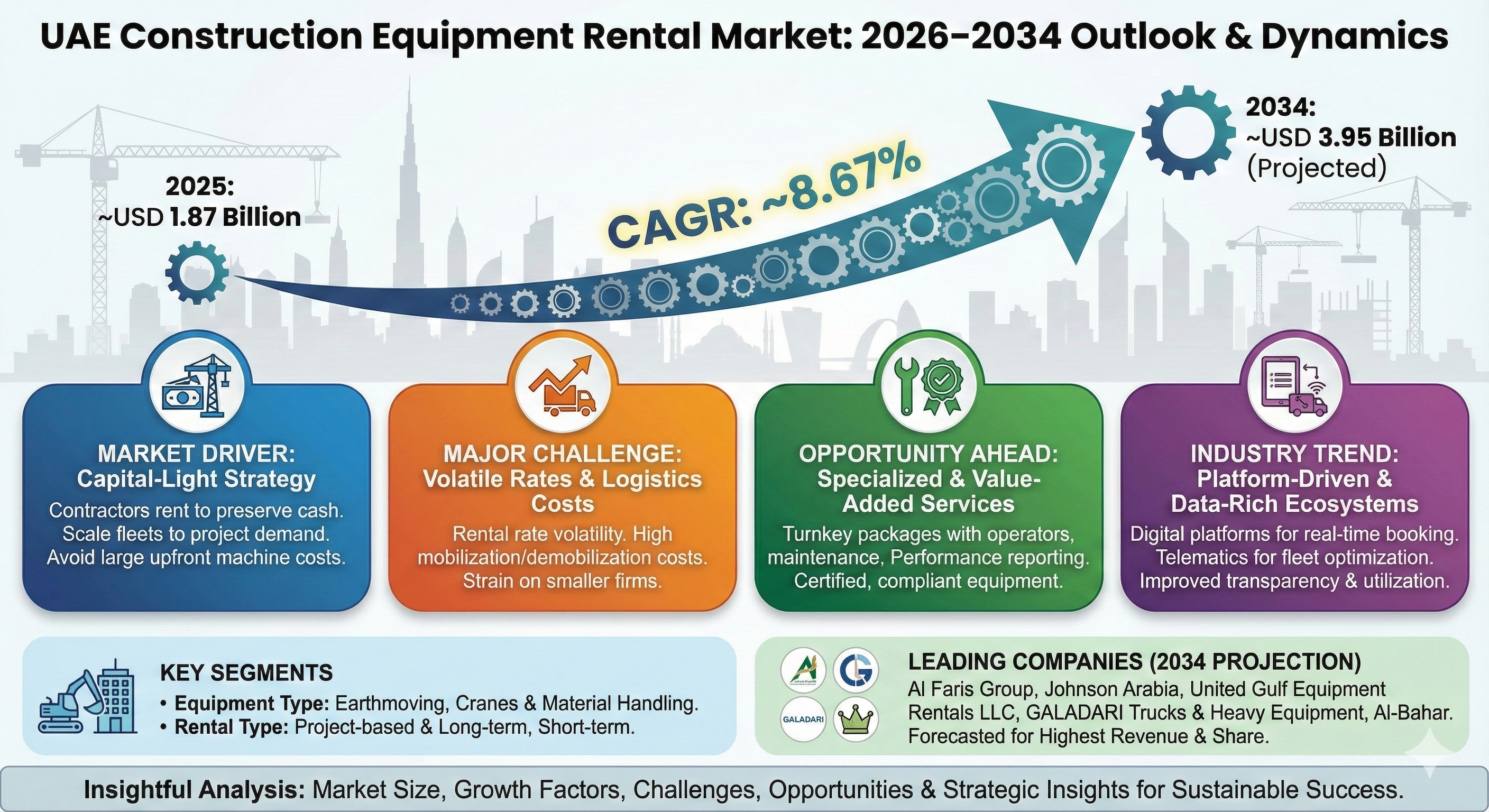 • According to the latest report by The Report Cube, study UAE Construction Equipment Rental Market is expected to grow at a CAGR of around 8.67% during 2026 - 2034.