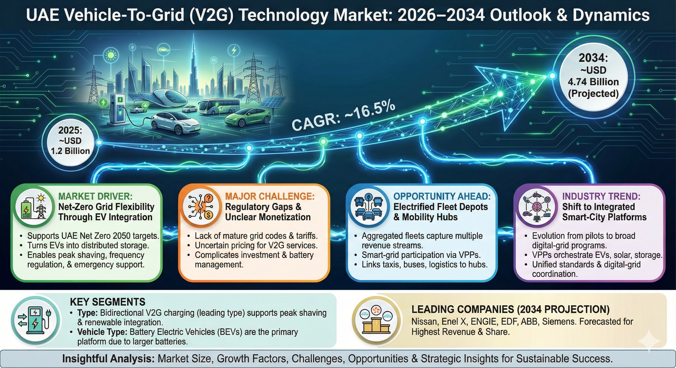• According to the latest report by The Report Cube, study UAE Vehicle-To-Grid (V2G) Technology Market is expected to grow at a CAGR of around 16.5% during 2026 - 2034.
