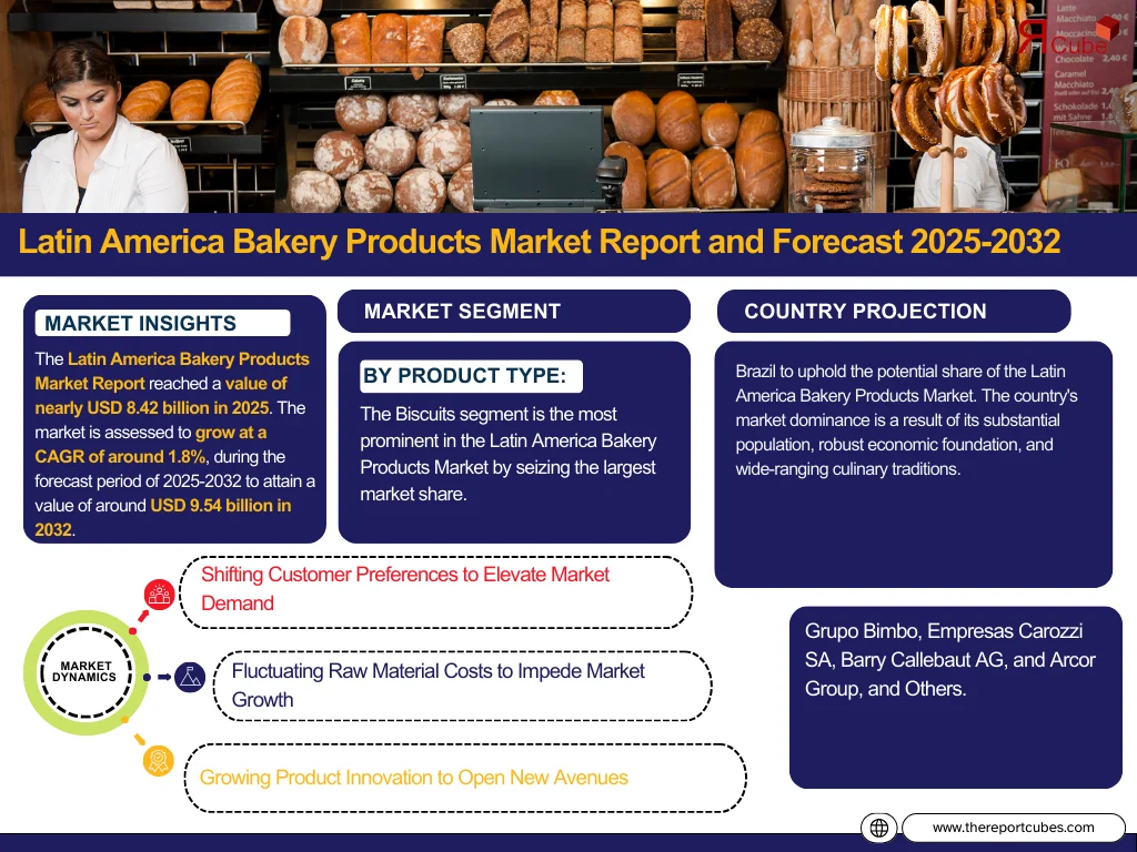 According to the latest report by The Report Cube, study Latin America Bakery Products Market is assessed to grow at a CAGR of around 1.8%, during the forecast period of 2025-2032 to attain a value of around USD 9.54 billion in 2032. It is predicted that the industry would experience substantial growth owing to changing customer tastes, increasing urbanization, and altering regional food consumption trends. Also, the dynamic landscape of the Latin America Bakery Products Market is marked by rising middle-class populations, mounting disposable incomes, and an increasing requirement for inventive & convenient bakery items.