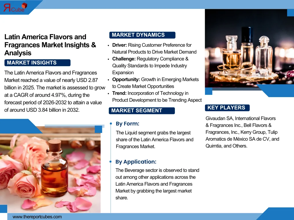According to the latest report by The Report Cube, study Latin America Flavors and Fragrances Market is assessed to grow at a CAGR of around 4.97%, during the forecast period of 2026-2032 to attain a value of around USD 3.84 billion in 2032. The major reason for this progression is the mounting demand for natural flavors & fragrances, which became one of the vital product categories with the maximum revenue in 2022. This market segment is presumed to maintain their leadership in the forthcoming years, further contributing to enhancing the Latin America Flavors and Fragrances Market share.