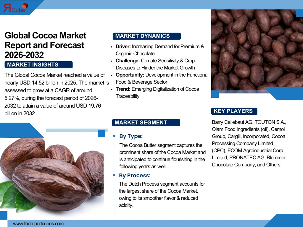 According to the latest report by The Report Cube, study Cocoa Market is assessed to grow at a CAGR of around 5.27%, during the forecast period of 2026-2032 to attain a value of around USD 19.76 billion in 2032. The primary aspects driving the Cocoa Market growth is the upsurge in the usage of dark chocolate, which is considered to be a better alternative.  Also, demand is being encouraged by consumers' increasing desire for fair-trade & organic cocoa, specifically in North America & Europe. Also, the leading companies are being influenced to embrace ethical sourcing practices by initiatives that support sustainable cocoa production, like the Cocoa & Forests Initiative (CFI), which is gaining traction.