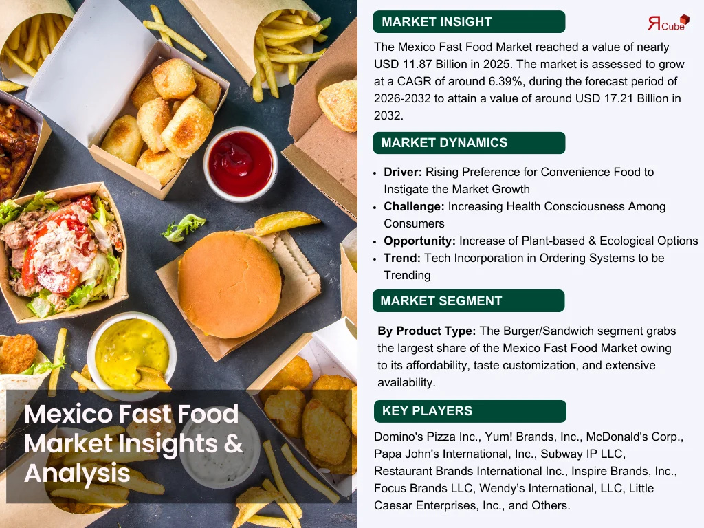 According to the latest report by The Report Cube, study Mexico Fast Food Market is assessed to grow at a CAGR of around 6.39%, during the forecast period of 2026-2032 to attain a value of around USD 17.21 Billion in 2032. The market continues to progress with increasing customer preferences for quick, reasonable, and tasty meals. With urbanization & increasing disposable incomes, there has been a substantial swing toward quick-service restaurants, which are becoming progressively prevalent among millennials & working professionals.