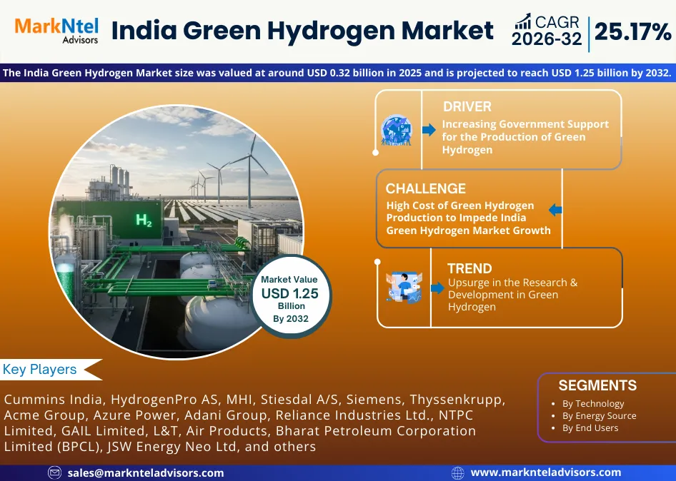 MarkNtel Advisors, a leading market research and consulting firm, has announced the release of its latest study titled India Green Hydrogen Market Research Report: Forecast (2026–2032). This report provides a detailed assessment of the India Green Hydrogen Market, covering its evolving dynamics, emerging trends, key growth drivers, major challenges, and competitive landscape.