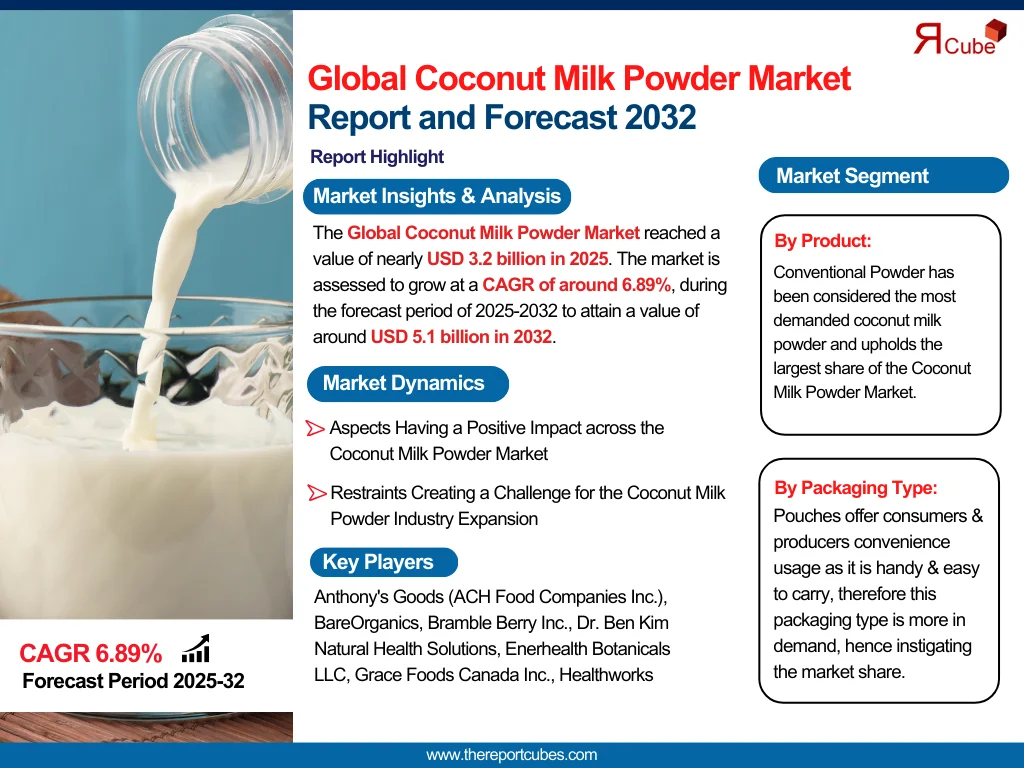 According to the latest report by The Report Cube, study Coconut Milk Powder Market is assessed to grow at a CAGR of around 6.89%, during the forecast period of 2025-2032 to attain a value of around USD 5.1 billion in 2032. A fine, white powder called "coconut milk powder" is made by spray-drying raw, unsweetened coconut cream. In addition to enriching calcium, iron, vitamins, sodium, and minerals, the powder is considered nutritive. They have various health benefits, such as aiding with digestive problems & improving cardiovascular health. One of the key aspects driving the expansion of the Coconut Milk Powder Market is the elevated worldwide awareness of its advantages over dairy substitutes. The industry is budding faster owing to the increasing usage of these powdered forms as cost-effective alternates for regular coconut milk, having a longer shelf life, and the surging processed & comfort food consumption brought on by demanding lifestyles.