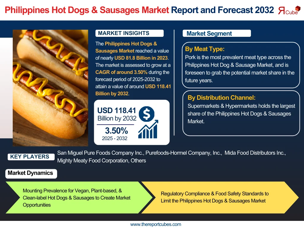 According to the latest report by The Report Cube, study Philippines Hot Dogs & Sausages Market is assessed to grow at a CAGR of around 3.50% during the forecast period of 2025-2032 to attain a value of around USD 118.41 Billion by 2032. Owing to escalating customer demand, altering dietary choices, and increasing urbanization, the Philippines Hot Dog & Sausage Market represents a generous share of the country's processed meat sector. Being staple in Filipino homes, hot dogs & sausages are frequently eaten in breakfast, as snacks, and as a well-liked street dish. In the Philippines, hot dogs & sausages are also preferred over other foods at sporting events, social gatherings, festivals, etc. Moreover, the specialized & distinctive combination of taste & nutrition found in Philippine hot dogs & sausages makes them a good source of energy & frequently filled with protein. Hence, as a result of their cultural behavior, more individuals have a propensity to consume.