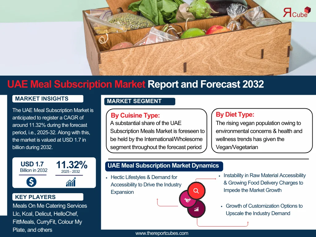 According to the latest report by The Report Cube, study UAE Meal Subscription Market is anticipated to register a CAGR of around 11.32% during the forecast period, 2025-32. Additionally, the market size was valued at nearly USD 5.34 billion in 2025 and is projected to reach nearly USD 11.32 billion by 2032. A varied range of consumers are served by the UAE Meal Subscription Industry, such as families, fitness enthusiasts, working professionals, and individuals with specific dietary needs. Meal kits & ready-to-eat meals are among the subscription options accessible, as are customized products with a health focus. The rising usage of technology & online platforms, which make meal planning & delivery easier, has led to the market's robust expansion.