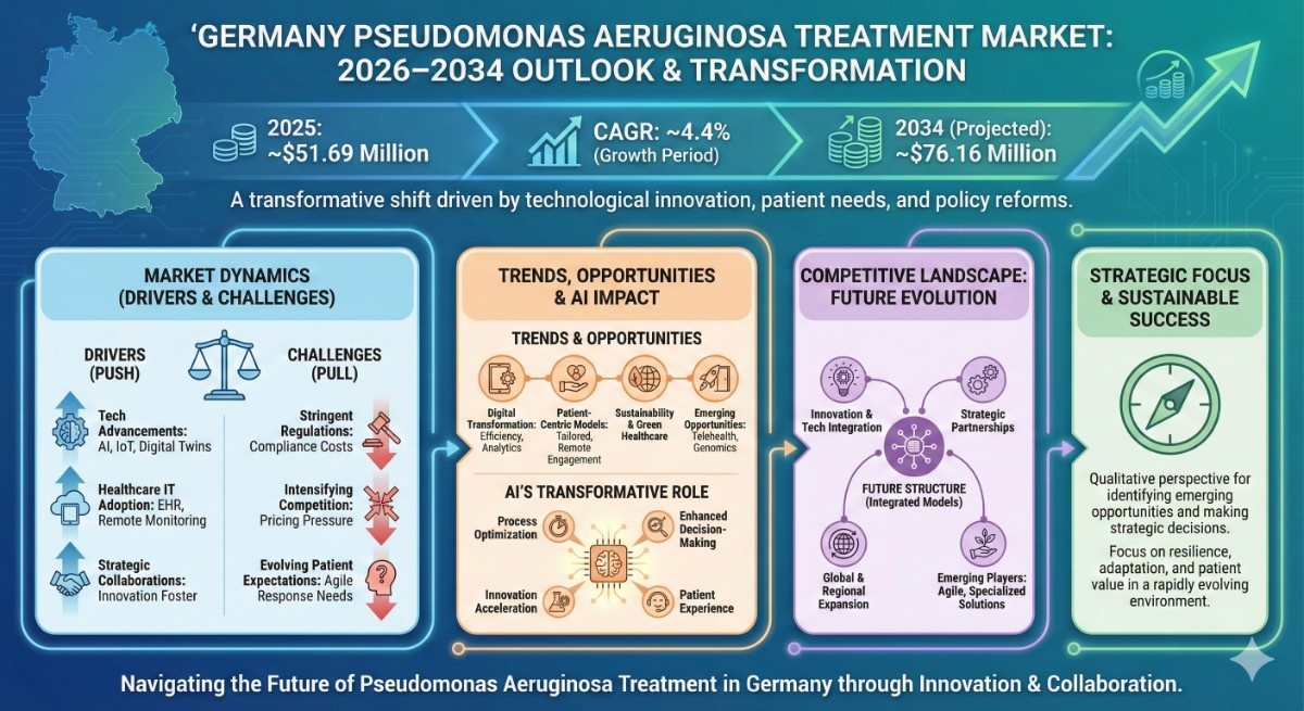 According to the latest report by The Report Cube, study Germany Pseudomonas Aeruginosa Treatment Market is anticipated to register a CAGR of around 4.4% during the forecast period, 2026-34. Additionally, the market size was valued at nearly USD 51.69 million in 2025 and is projected to reach nearly USD 76.16 million by 2034. The market is undergoing a transformative shift, driven by technological innovation, evolving patient expectations, policy reforms, and data-driven care models. This report provides a qualitative perspective to assist stakeholders in identifying emerging opportunities and making strategic decisions within the industry landscape.