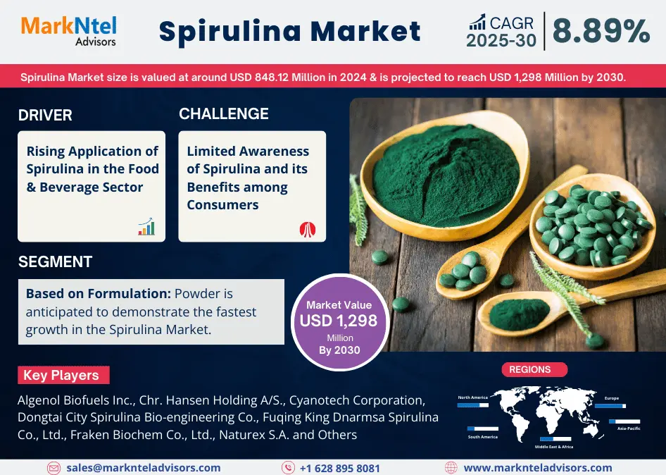 MarkNtel Advisors, a leading market research and consulting firm, has announced the release of its latest study titled Spirulina Market Research Report: Forecast (2025–2030). This report provides a detailed assessment of the Spirulina Market, covering its evolving dynamics, emerging trends, key growth drivers, major challenges, and competitive landscape.