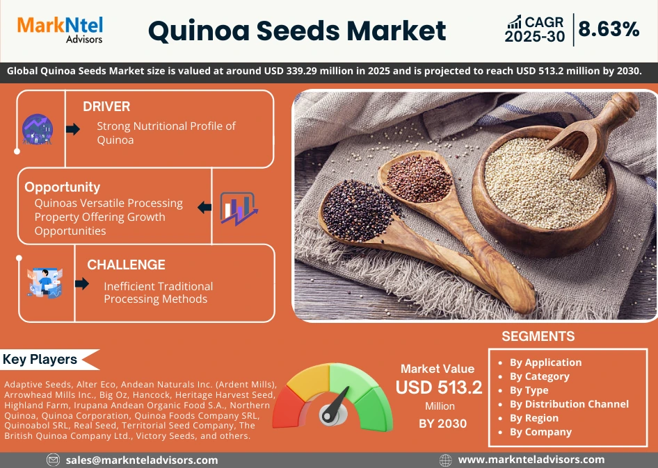 MarkNtel Advisors, a leading market research and consulting firm, has announced the release of its latest study titled Quinoa Seeds Market Research Report: Forecast (2025–2030). This report provides a detailed assessment of the Quinoa Seeds Market, covering its evolving dynamics, emerging trends, key growth drivers, major challenges, and competitive landscape.