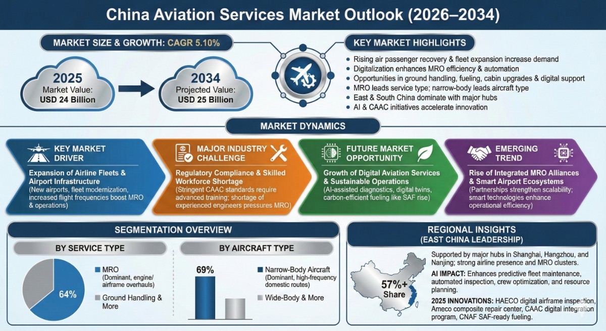 According to the latest report by The Report Cube, study China Aviation Services Market is anticipated to register a 5.10% CAGR during 2026–2034. The market size was valued at USD 24 billion in 2025 and is projected to reach USD 25 billion by 2034.