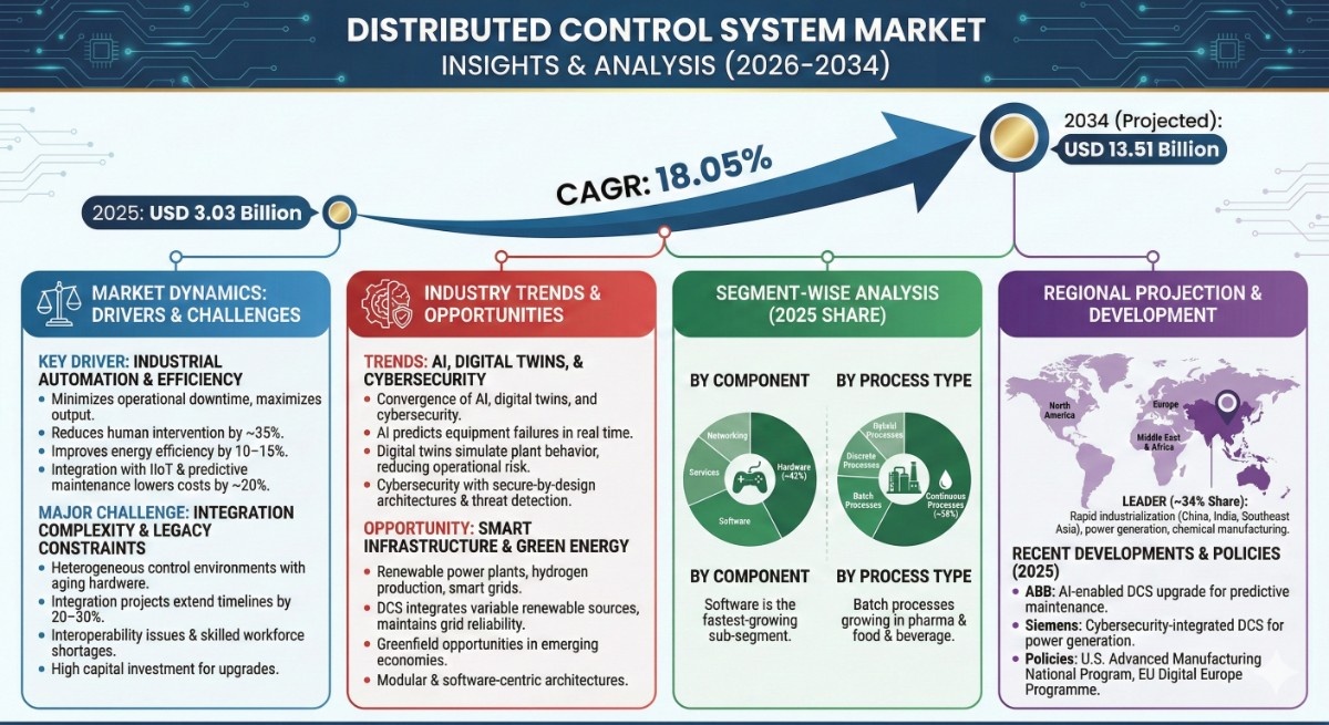 According to the latest report by The Report Cube, study Distributed Control System Market is anticipated to register a CAGR of 18.05% during 2026–2034. The market size was valued at USD 3.03 Billion in 2025 and is projected to reach USD 13.51 Billion by 2034.