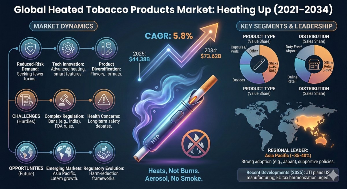 According to the latest report by The Report Cube, study Heated Tobacco Products Market is anticipated to register a 5.8% CAGR during 2021–2034. The market size was valued at USD 44.38 billion in 2025 and is projected to reach USD 73.62 billion by 2034. Heated tobacco products (HTPs) have increasingly attracted both industry investment and consumer attention as regulators and manufacturers navigate evolving tobacco consumption patterns. HTPs heat tobacco without burning it, creating a nicotine-containing aerosol rather than smoke, which many consumers perceive as a potentially reduced-harm alternative to combustible cigarettes.
