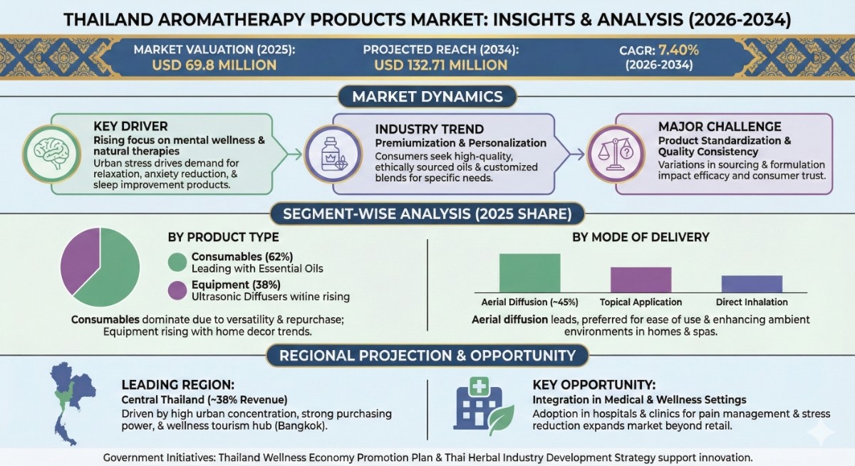 According to the latest report by The Report Cube, study Thailand Aromatherapy Products Market is anticipated to register a CAGR of 7.40% during 2026-2034. The market size was valued at USD 69.8 million in 2025 and is projected to reach USD 132.71 million by 2034. This strong growth outlook reflects Thailand’s deep-rooted wellness culture combined with rising consumer awareness around holistic health, stress management, and natural personal care solutions.