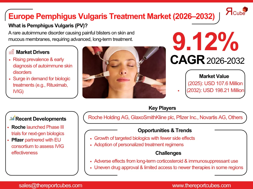 According to the latest report by The Report Cube, study Europe Pemphigus Vulgaris Treatment Market is anticipated to register a CAGR of around 9.12% during the forecast period, 2026-32. Also, the market size is valued at nearly USD 107.6 million in 2025 and is foreseen to witness nearly USD 198.21 million during 2032. An autoimmune ailment that affects the immune system & causes severe blisters on the skin & mucous membranes is known as pemphigus vulgaris (PV). As admittance to cutting-edge biologic medicines, early diagnosis, and consciousness rise across the region, so does the requirement for effective treatment adoptions.