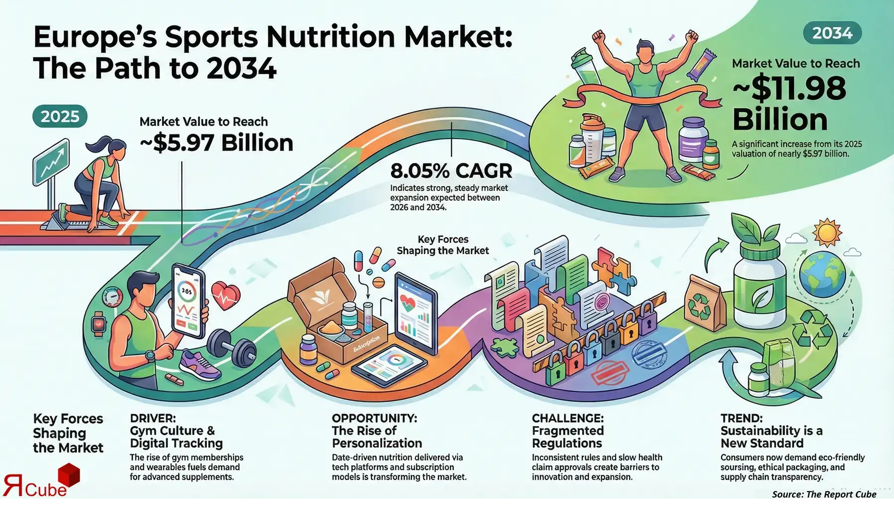 According to the latest report by The Report Cube, study Europe Sports Nutrition Market is anticipated to register a CAGR of 8.05% during 2026-2034. The market size was valued at USD 5.97 billion in 2025 and is projected to reach USD 11.98 billion by 2034. The market is experiencing robust momentum, supported by rising health awareness, increasing gym memberships, and the growing influence of fitness-oriented lifestyles across Europe. Sports nutrition products are no longer limited to professional athletes, as recreational fitness enthusiasts and lifestyle users now represent a significant consumer base.