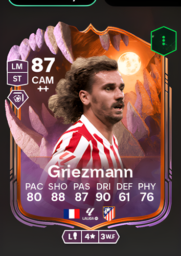 Antoine Griezmann's Ultimate Scream card features the French star as a Central Attacking Midfielder with a formidable overall rating of 87. Boasting exceptional attributes like 88 shooting, 87 passing, and 90 dribbling, Griezmann is crafted to be the creative heartbeat of any squad. In this pivotal role, his high technical ratings make him a sharp and incisive playmaker, capable of unlocking the tightest defenses with precise through balls, deft dribbling, and clinical finishing to decisively seal victories in the final third.