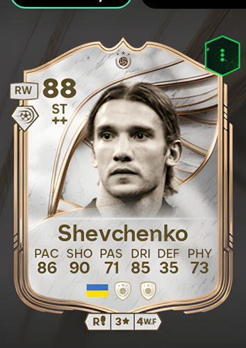 Andriy Shevchenko's Icon card, featuring the legendary Ukrainian striker with an impressive overall rating of 88, is a formidable asset in any attacking lineup. With standout attributes including a blistering 86 pace, a clinical 90 shooting, and agile 85 dribbling, Shevchenko is engineered to be the ultimate goal threat. As a striker, his primary advantage lies in his exceptional ability to exploit defensive gaps with his speed and movement, allowing him to tear apart the opposition's backline. Once in position, his world-class finishing and composure enable him to seize even the slightest opportunity, making him the perfect player to score decisive goals and seal victory in crucial moments.