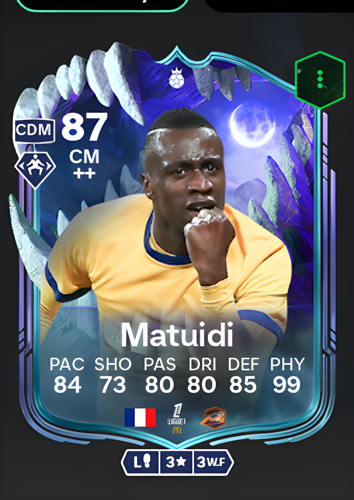 Introducing Blaise Matuidi's Ultimate Scream Hero card, a formidable 87-rated Center Midfielder who brings a commanding presence to the heart of the pitch. Boasting an impressive pace of 84, passing and dribbling both at 80, and a robust defensive rating of 85, Matuidi is a versatile engine for any midfield. His standout attribute is an immense physicality rating of 99, making him an immovable force in challenges. The advantages of this card are perfectly tailored to his role; as a box-to-box midfielder, his exceptional stamina and strength allow him to dominate both defensively and in transition, breaking up opposition attacks with tenacious tackles and then driving forward to support the offense, effectively controlling the tempo and sealing the midfield battle in your favor.
