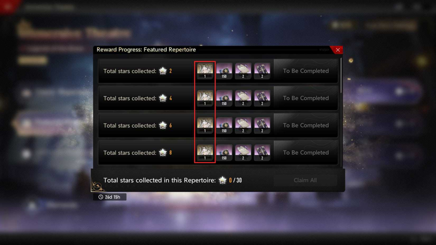 This featured repertoire becomes accessible only after completing all seven acts of the classic repertoire, requiring significant progress through building and combat challenges.